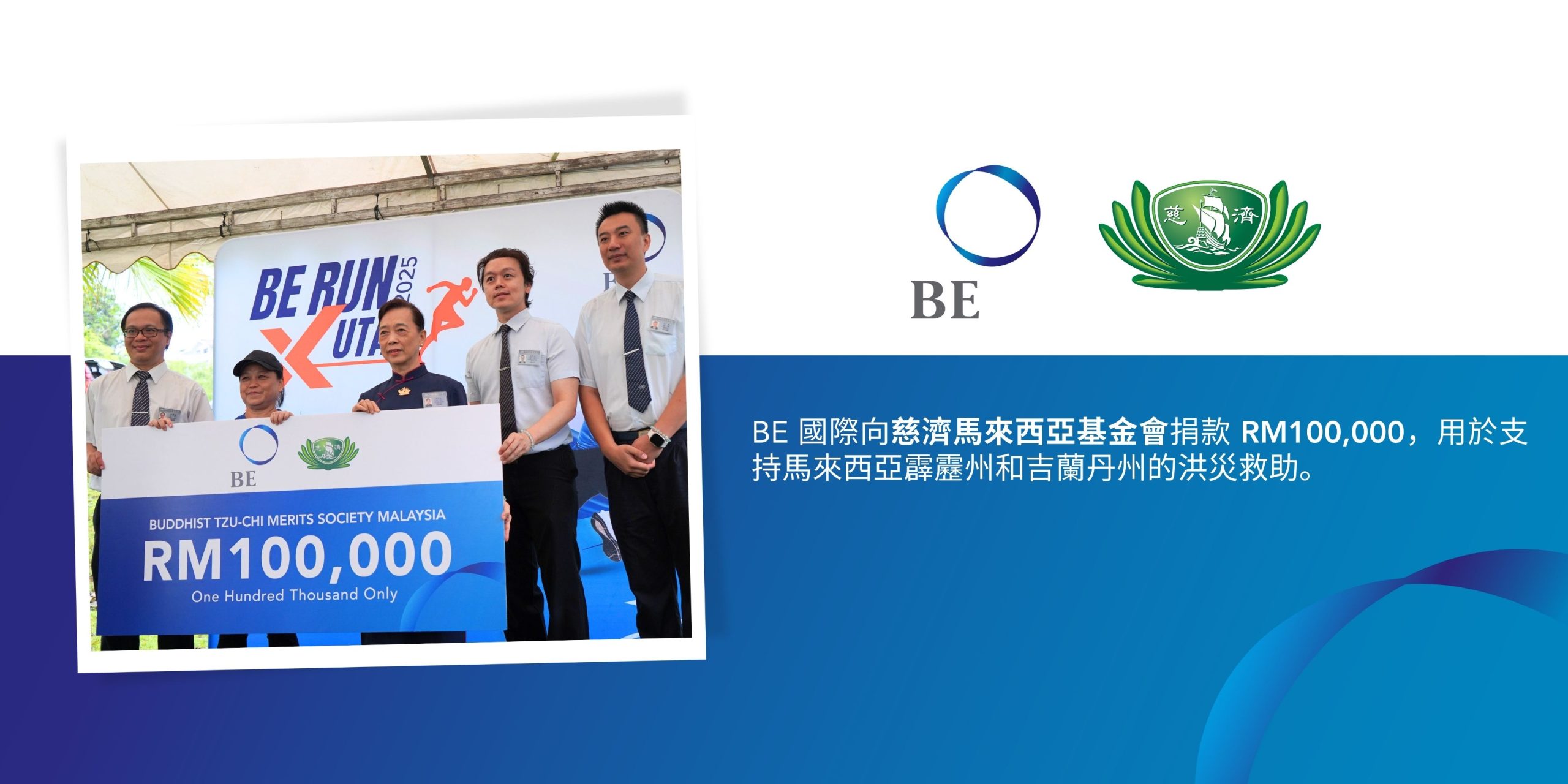除了慈善跑之外,BE Foundation 希望為近期受天災困擾的災黎出一份力,捐贈 RM200,000 (約港幣 HKD 380,000)以援助受災社區,其中 RM100,000 (約港幣 HKD 190,000)撥給慈濟馬來西亞基金會,用於支持在馬來西亞霹靂州和吉蘭丹州的洪災救助,RM100,000(約港幣 HKD 190,000) 撥給首要媒體新海峽時報賑災基金,用於支持馬來西亞霹靂州、吉打州和玻璃市州的近期洪災受災者。