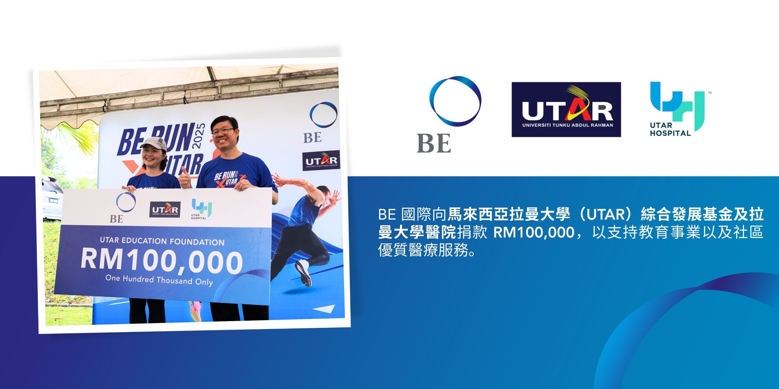 此次義跑活動的所有淨收益均撥入馬來西亞拉曼大學(UTAR)綜合發展基金及拉曼大學醫院,用於支持教育事業以及關注社區優質醫療服務。透過此次活動,BE 國際向拉曼大學(UTAR)發展基金捐贈了 RM100,000(約港幣 HKD 190,000),進一步彰顯我們對社區福祉的承諾。