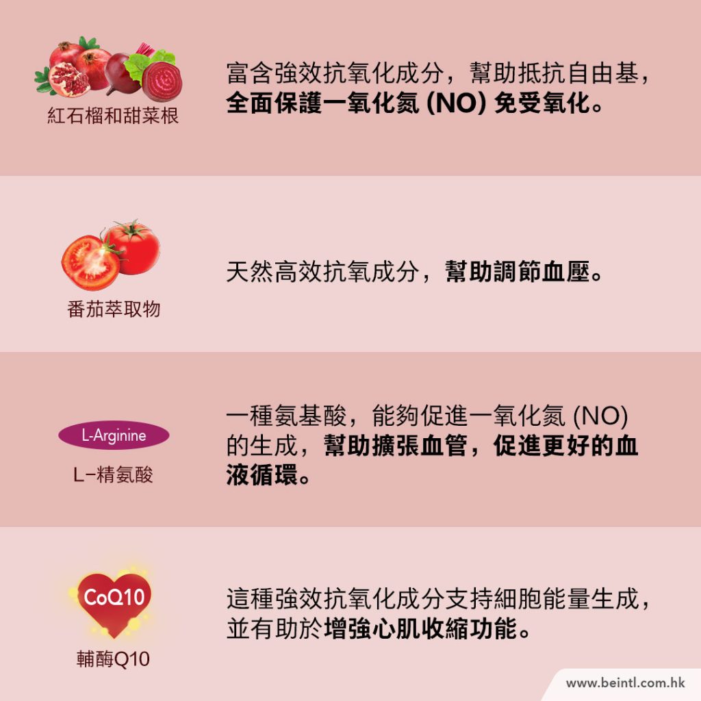 • L-精氨酸 (L-Arginine) – WebMD指出,L-精氨酸是一種氨基酸,人體可將其轉化為一氧化氮,有助於血管擴張,改善血液循環。